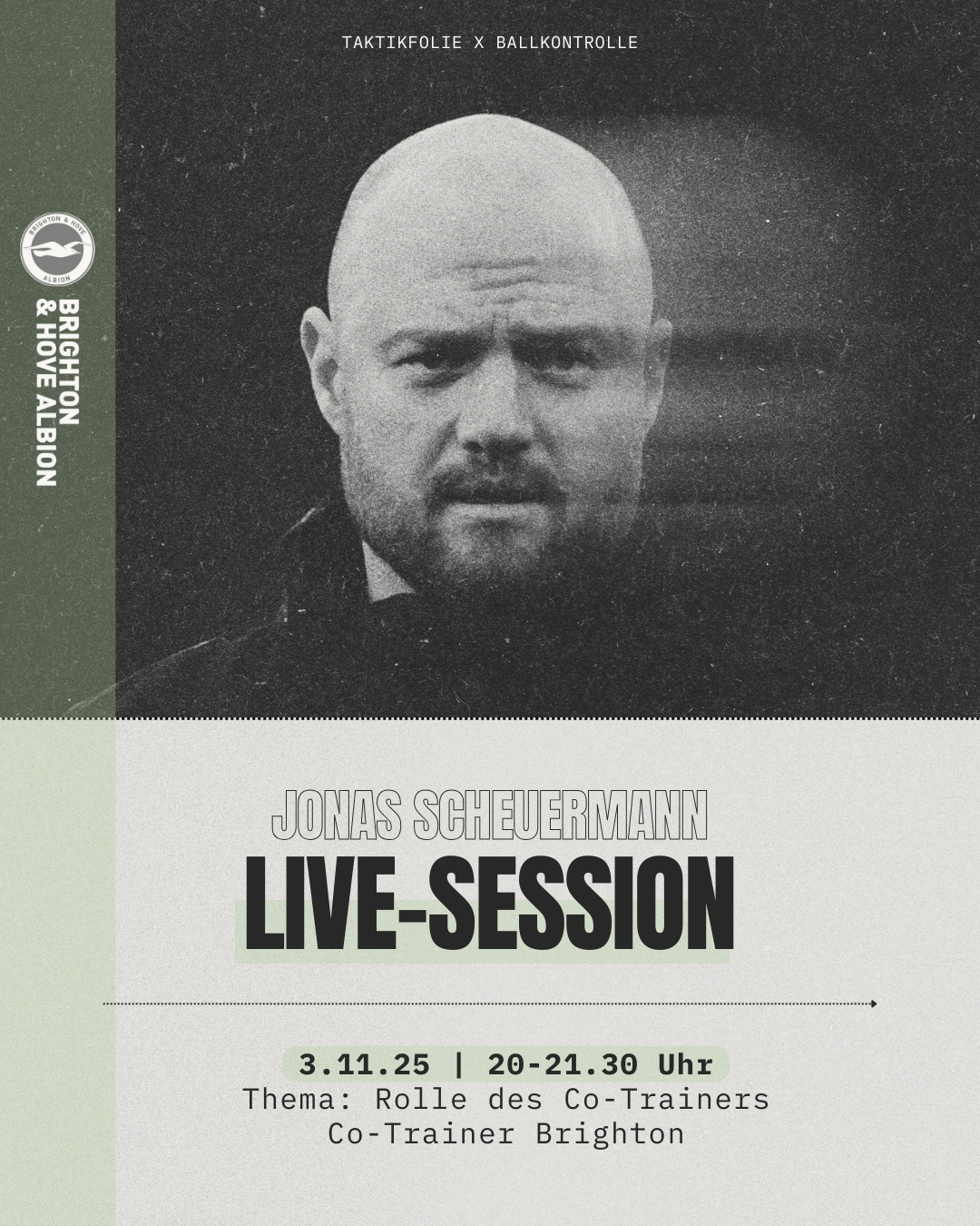 Am 3.11.25 veranstalten wir gemeinsam mit Ballkontrolle ein exklusives Online-Event. Mit dabei ist Jonas Scheuermann, Inhaber der UEFA Pro-Lizenz und Co-Trainer von Fabian Hürzeler bei Brighton. Jonas wird zunächst von seiner Rolle als Co-Trainer im Trainerteam berichten und die Zusammenarbeit mit dem Cheftrainer vorstellen. Anschließend hast du die Möglichkeit, ihm deine eigenen Fragen zu stellen.